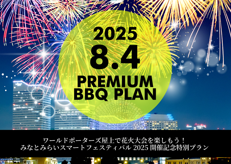 2025年8月4日(月)19:00~ みなとみらいスマートフェスティバル 2025の花火大会が見えるワールドポーターズ屋上でBBQが楽しめるプレミアムプランです。